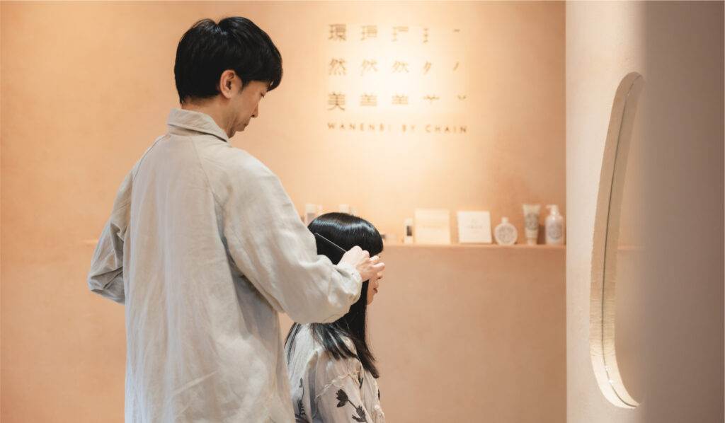 CHAINが大切にする「瞬間美ではなく、今とこれからをつなぐ」という哲学は、環然美のあらゆるサービスに息づいています。環然美では施術当日の美しさはもちろん、お客様が自宅に帰ってからも、そのスタイルを自分で再現し、長く維持できることを重視。そのための細やかなカット技術や、日々のホームケアに関する提案も徹底しています。